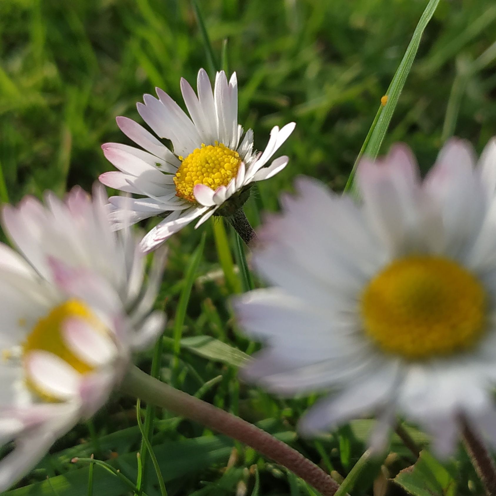 Primeras señales de la Primavera, fotografía tomada en el jardín de casa durante el confinamiento debido al coronavirus. Se destaca una de ellas, Margarita, el nombre de nuestra protagonista.